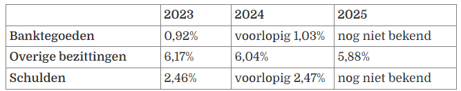 Tegelijkertijd met de aanpassingen maakte de staatssecretaris ook de definitieve forfaitaire rendementspercentages voor banktegoeden en schulden voor het jaar 2023 en het definitieve forfaitaire rendementspercentages voor overige bezittingen voor 2025 bekend. Ook de percentages waarmee in 2024 bij het berekenen van de voorlopige aanslagen 2024 gerekend wordt voor banktegoeden en schulden zijn bekend. U vindt ze in de hierna onderstaande tabel.